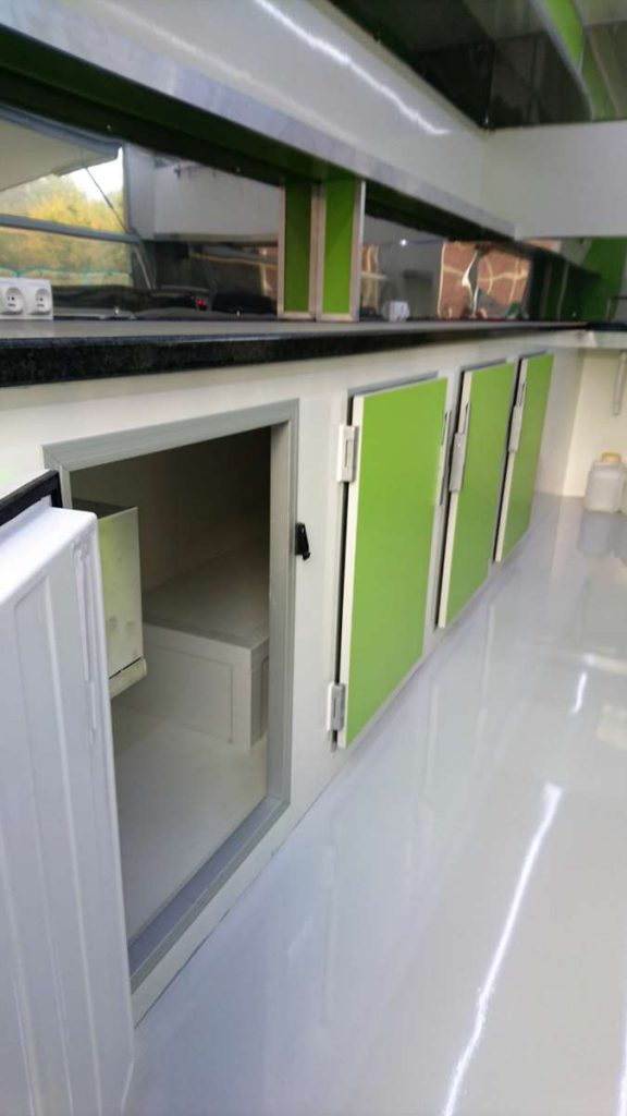 -Création d’un espace de préparation avec emplacement pour appareils de cuisson et espace sanitaire avec lave-mains intégré.